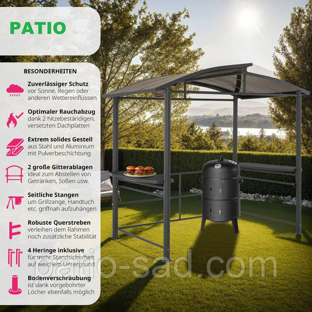Привабливим елементом відкритої конструкції гриль-павільона є зсувний дах, який захищає від дощу та сонця й водночас забезпечує гарне димовидалення. Харчові продукти, соуси та інше начиння зручно зберігати на бічних ажурних полицях, а перекладини внизу ідеально підходять для зберігання серветок, щипців, лопаток тощо. Міцна конструкція павільйону характеризується стабілізувальними перекладинами та чотирма міцними ніжками, стійкість якого можна додатково підвищити завдяки кріпленням, що входять до комплекту.