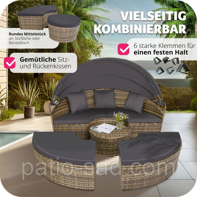 Функціональний сонячний острів із ротанга вирізняється привабливим зовнішнім виглядом і високим комфортом сидіння або лежання. Окремі елементи комплекту індивідуально комбінуються й обладнані водонепроникними подушками. Комплект можна використовувати як комплект для вітальні або як простий диван. Міцний дах кріпиться на липучці та забезпечує захист від спеки та вітру.